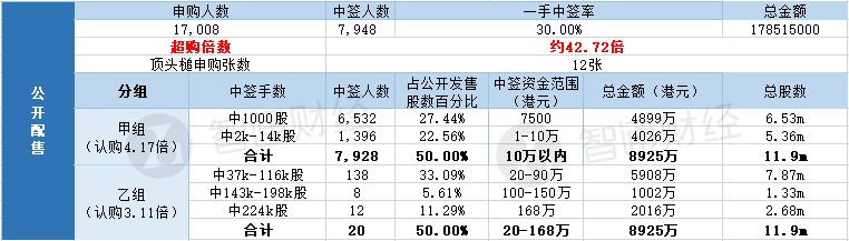 其中,公开配售申购人数为17008,一手中签率30%,认购倍数约42.72倍。