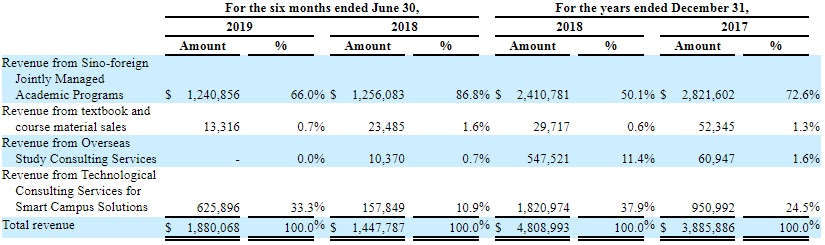 海外留学咨询是另一个围绕海外留学生提供的服务,该业务产生的收入在2018年一度暴增798%,至54.8万美元,但是2019年该项服务居然不产生收入。从招股书披露的信息来看,2018年上半年,该业务也只招收到一名学生,说明该项服务主要在下半年爆发。这项业务能不能持续增长,还要看2019年下半年数据,现在还不得而知。