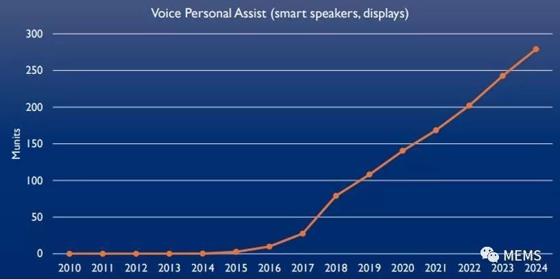 “要使语音与设备交互并使语音命令正常工作,需要使用麦克风来捕捉语音。”Damianos说道。而MEMS麦克风被采用的关键驱动因素是其高语音捕获质量、高保真度、低失真和超低功耗。“预计到2023年,智能音箱和智能显示器的数量将达到约2.5亿台。如果每台设备使用2~7颗麦克风(例如Google Home Mini和Amazon Alexa),我们认为MEMS麦克风的市场潜力非常值得期待。”