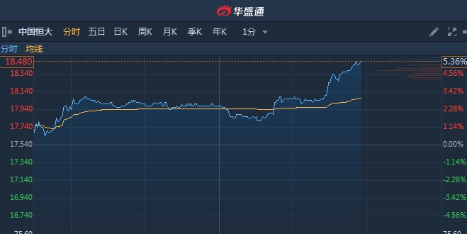 智通财经APP获悉,内房板块随大市普涨,中国恒大(03333)午后涨幅扩大逾5%,领涨内房股。截至14时54分,涨5.36%,报价18.48港元,成交额3.198亿。