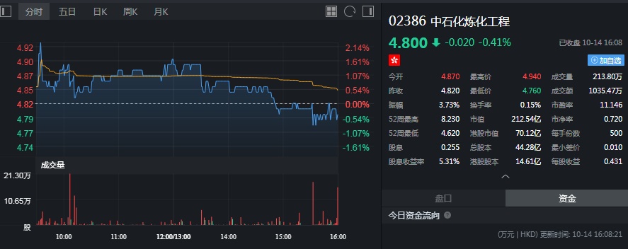 截至今日收盘,中石炼化工程(02386)跌0.41%,报4.80港元。