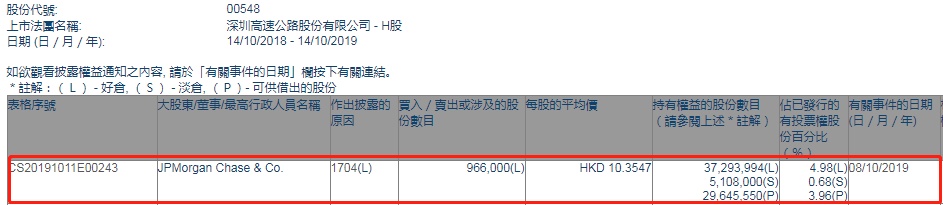 智通财经APP获悉,联交所最新资料显示,10月8日,摩根大通减持深高速(00548)96.60万股,每股作价10.3547港元,总金额约为1000.24万港元。减持后持股数目约为3729.40万股,持股比例为4.98%。