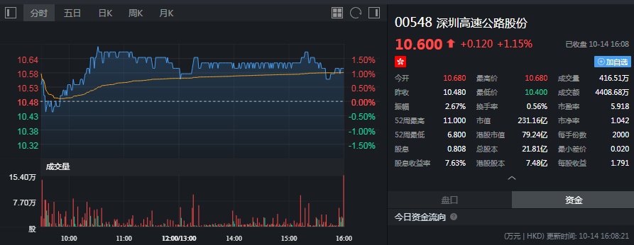 截至今日收盘,深高速(00548)涨1.15%,报10.60港元。