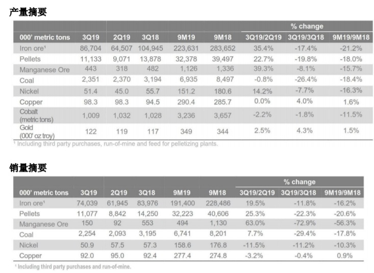 第三季度,铁矿粉和球团矿销量达到 8510 万吨,较上季度增长了 20.2%。淡水河谷重申,2019 年铁矿石与球团矿的指导销量在 3.07 亿吨至 3.32亿吨的范围内,目前对销量的预期接近该范围的中间值。