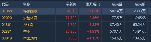 截至发稿,特步国际涨5.46%,报4.83港元;安踏体育(02020)涨2.28%,报71.65港元;361度(01361)涨2.33%,报1.76港元;李宁(02331)涨1.74%,报26.3港元。