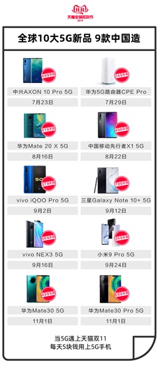 当5G遇上天猫双11,全球5G新品扎堆天猫首发。据悉,天猫双11将集结华为Mate 30 5G、vivoNEX3 5G、三星Note 10+ 5G等全球已上市的十大5G新品,值得一提的是,这其中有9款为国货产品。