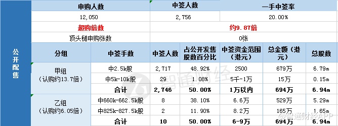 其中,公开配售申购人数12050,一手中签率20%,超购倍数约9.87倍。