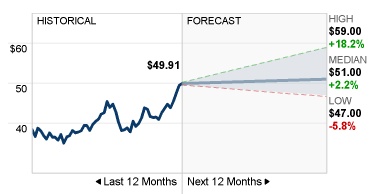 股价方面,5位分析师预计台积电未来12个月内的股价中值为51美元,最高59美元,最低47美元。该预估中值较上一次49.91的价格上涨2.18%。