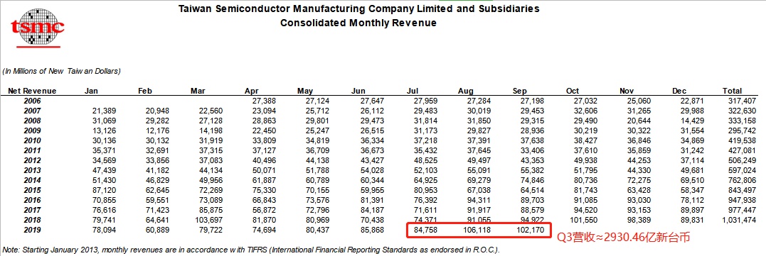 得益于市场对公司7nm产品的强劲需求和有利的汇率变动,公司Q3营收创历史新高,达到2930亿新台币,环比增长22%,同比增长13%,大幅超过此前公司预期。