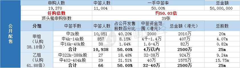 其中,公开配售申购人数19370,一手中签率50%,认购倍数约50.03倍。