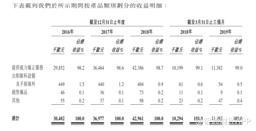 目前,德视佳的核心收入来源为提供视力矫正服务业务,该业务在2016年至2018年实现快速增长,并于2018年达到4238.6万欧元,占公司总收入的98.7%,2019年一季度,公司视力矫正服务业务收入达到1138.3万欧元,占比进一步提升至99%。
