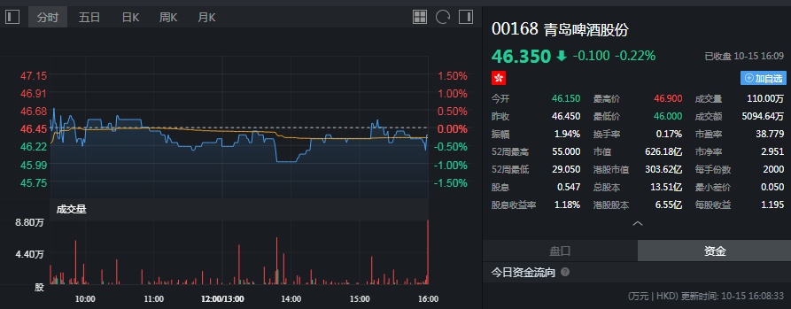截至今日收盘,青岛啤酒跌0.22%,报46.35港元。