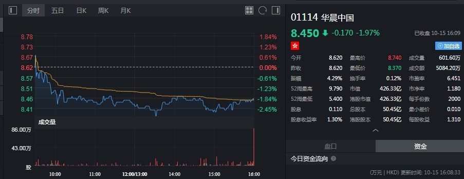 截至今日收盘,华晨中国跌1.97%,报8.45港元。