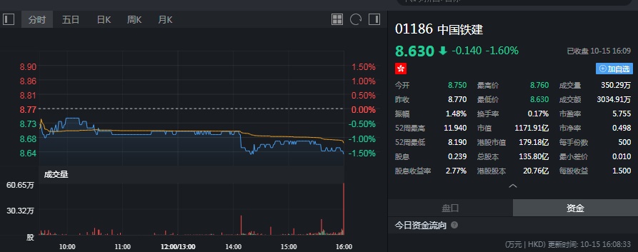 截至今日收盘,中国铁建跌1.60%,报8.63港元。