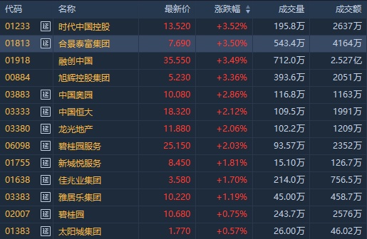 截至发稿,中国奥园(03883)涨4.08%,报10.2港元;时代中国控股(01233)涨4.13%,报13.6港元;融创中国(01918)涨3.78%,报35.65港元;中国金茂(00817)涨3.59%,报5.19港元。