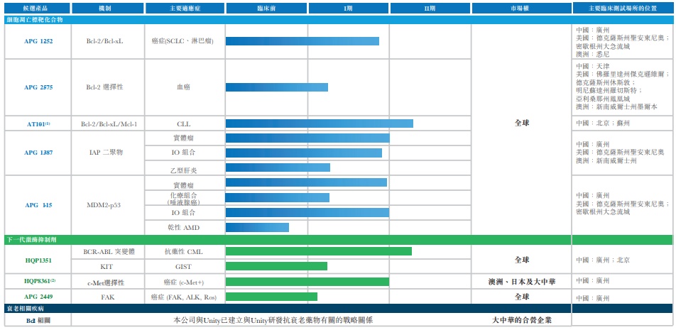 亚盛医药现已拥有当下全球最全的细胞凋亡药物管线。截至今年6月30日,公司共拥有8个产品处于临床开发阶段,28个正在进行的临床试验和21个在全球范围内提交的INDs。APG-1252、APG-2575、APG-115以及HQP1351为亚盛医药研发管线中的主要产品。