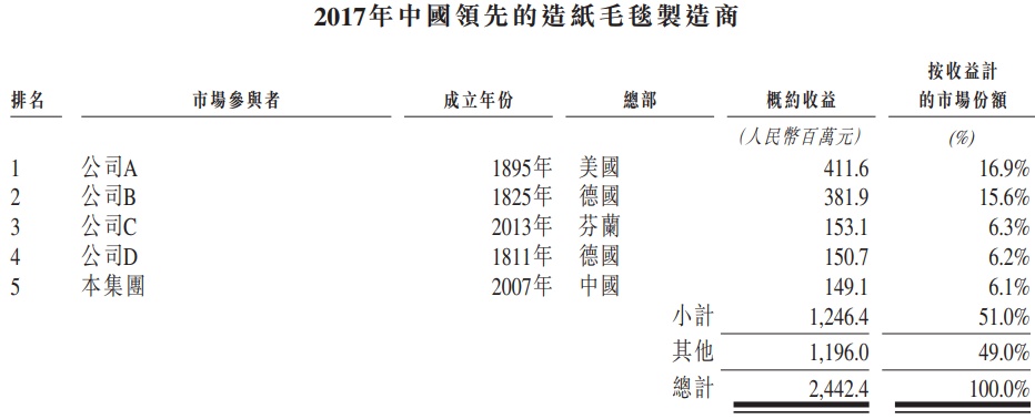 然而一些行业上游的上游,依然由外国企业主导,例如瓦楞纸板的上游——造纸毛毯。中国的造纸毛毯制造商比较集中,2017年前五大制造商市占率51%,且只有第五名是中国企业,市占率6.1%,这家中国企业便是环龙科技。