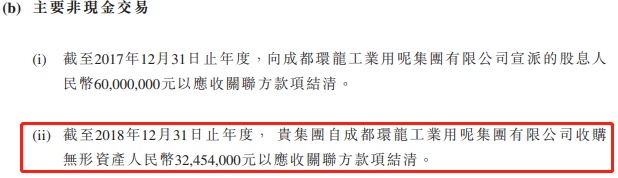 从上图还能发现,2018年的应收关联方款项减少了近3300万元。但是从附注上并没有解释这种异常变动。反而能看到无形资产增加了3600多万元,同比增加超过10倍。附注中显示主要是从外部添置了3245万元的无形资产,而支付手段使用应收关联方款项支付。