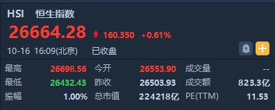 智通财经APP获悉,恒生指数开盘涨49.97点或0.19%,报26553.9点。截至收盘,恒生指数涨160.35点或0.61%,报26664.28点,全日成交额达823.36亿。国企指数涨0.3%,报10532.17点,红筹指数涨0.3%,报4294.59点。