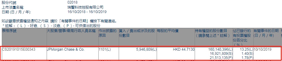 智通财经APP获悉,联交所最新资料显示,10月10日,摩根大通增持瑞声科技(02018)594.6809万股,每股作价44.713港元,总金额约为2.66亿港元。增持后最新持股数目约为1.60亿股,最新持股比例为13.25%。