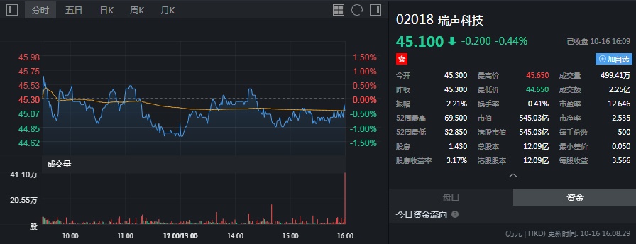 截至今日收盘,瑞声科技跌0.44%,报45.1港元。