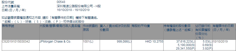 智通财经APP获悉,联交所最新资料显示,10月10日,摩根大通增持深高速(00548)99.9086万股,每股作价10.2755港元,总金额约为1026.61万港元。增持后最新持股数目约为3761.62万股,最新持股比例为5.03%。