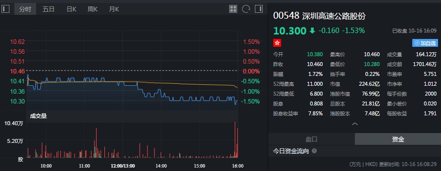 截至今日收盘,深高速跌1.53%,报10.3港元。