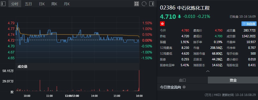 截至今日收盘,中石化炼化工程跌0.21%,报4.71港元。