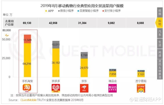 8月,手机淘宝APP用户规模为6.42亿,“淘宝-支付宝小程序”用户数1.15亿,去重后的全景用户规模为6.91亿;
