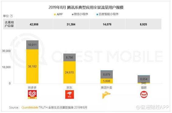 在释放微信生态价值方面,拼多多也保持领先态势。8月,“拼多多-微信小程序”的用户规模超过1亿,与“淘宝-支付宝小程序”的用户规模相仿,领先京东、美团、猫眼等应用,位列微信小程序生态圈首位。