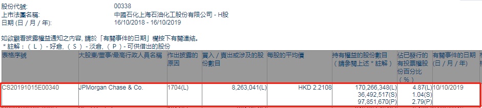 智通财经APP获悉,联交所最新资料显示,10月10日,摩根大通减持上海石化(00338)826.3041万股,每股作价2.2108港元,总金额约为1826.79万港元。减持后最新持股数目约为1.70亿股,最新持股比例为4.87%。