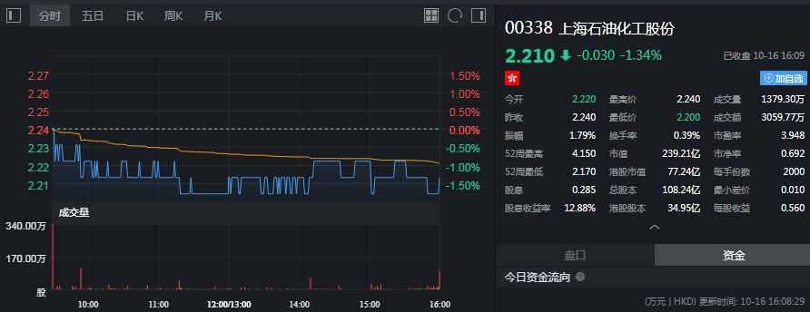 截至今日收盘,上海石化跌1.34%,报2.21港元。