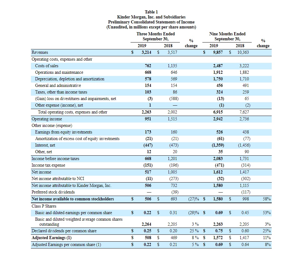 KMI董事会批准了第三季度的现金股息为每股0.25美元,该股息将于2019年11月15日支付给截至2019年10月31日营业日止登记在册的普通股股东。