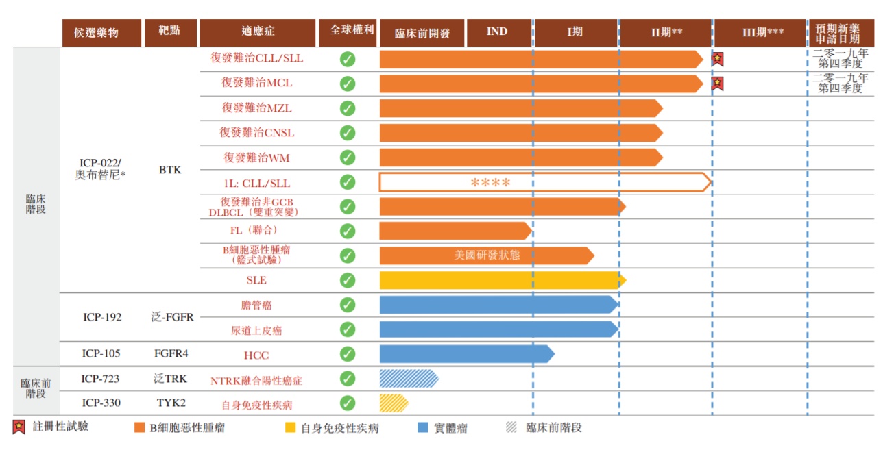 根据弗若斯特沙利文的报告,2018年,全球肿瘤药物市场规模达到1281亿美元,而自身免疫药物的全球市场规模则达到1137亿美元。 诺诚健华的管线中有三种处于临床阶段并涵盖了主要癌症适应症且具有潜力成为同类最佳及╱或首创的肿瘤候选药物,包括奥布替尼(预期将于2019年底向中国药监局提交新药申请)、ICP-192及ICP-105。