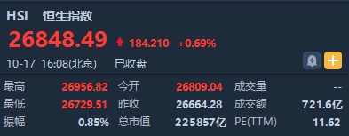 智通财经APP获悉,恒生指数开盘涨144.76点或0.54%,报26809.04点。截至收盘,恒生指数涨184.21点或0.69%,报26848.49点,全日成交额达721.62亿。国企指数涨0.53%,报10588.17点,红筹指数涨0.93%,报4334.38点。