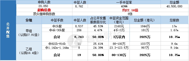 其中,公开配售申购人数20050,一手中签率40%,超购倍数22.16倍。