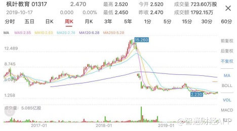 智通财经APP注意到,枫叶教育股价自2018年8月以来,一直处于震荡下行走势当中。进入到10月,公司股价原本有不错的反弹,但枫叶教育在10月15日发布公司入学学生人数增速大幅下滑的公告之后,立马吞噬了前期涨幅。