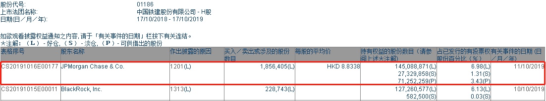 智通财经APP获悉,联交所最新资料显示,10月11日,摩根大通减持中国铁建(01186)185.64万股,每股作价8.8338港元,总金额约为1639.9万港元。减持后最新持股数目约为1.45亿股,最新持股比例为6.98%。