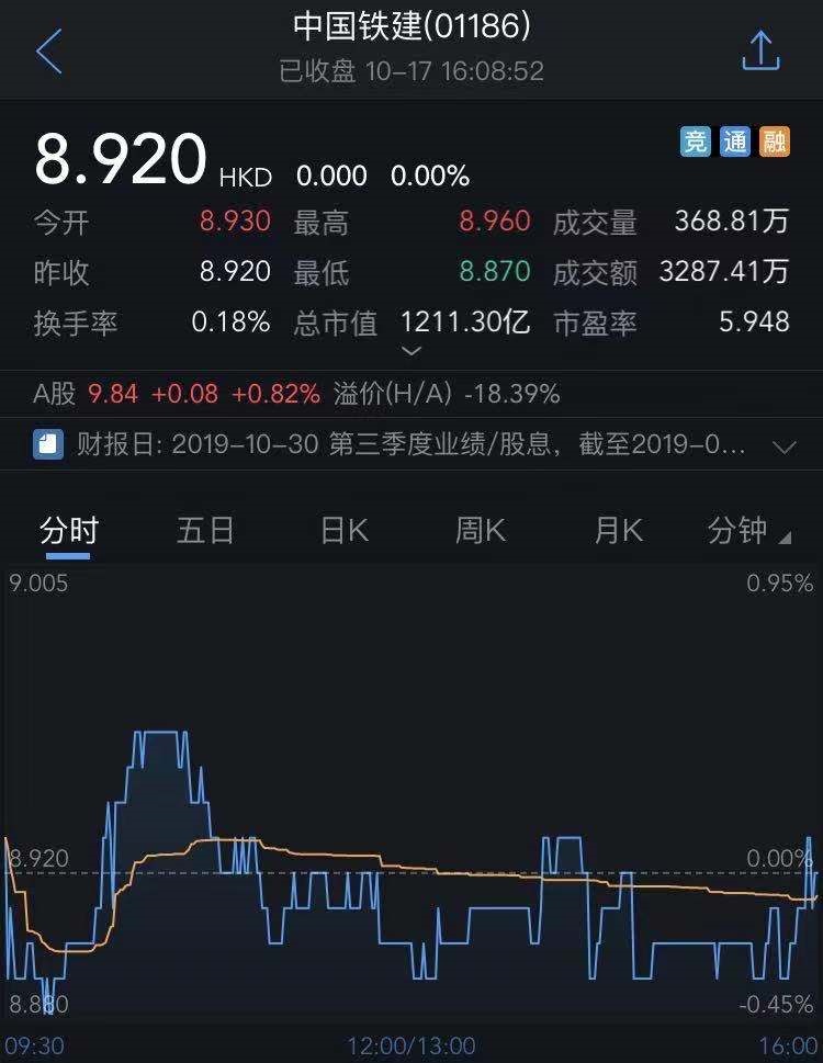 截至今日收盘,中国铁建无涨跌,报8.92港元。