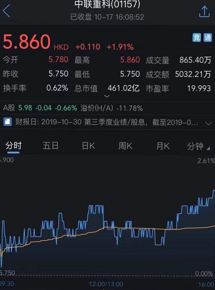 截至今日收盘,中联重科涨1.91%,报5.86港元。