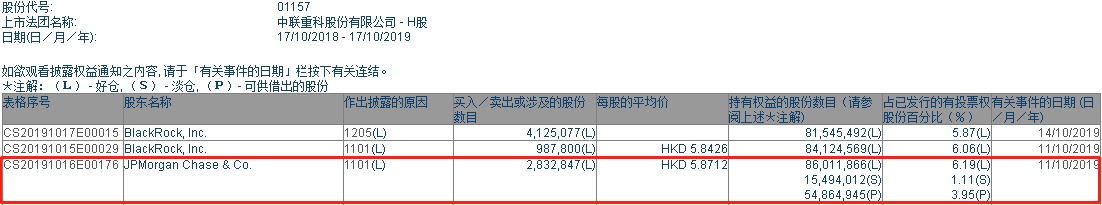 智通财经APP获悉,联交所最新资料显示,10月11日,摩根大通增持中联重科(01157)283.28万股,每股作价5.8712港元,总金额约为1663.22万港元。增持后最新持股数目约为8601.2万股,最新持股比例为6.19%。