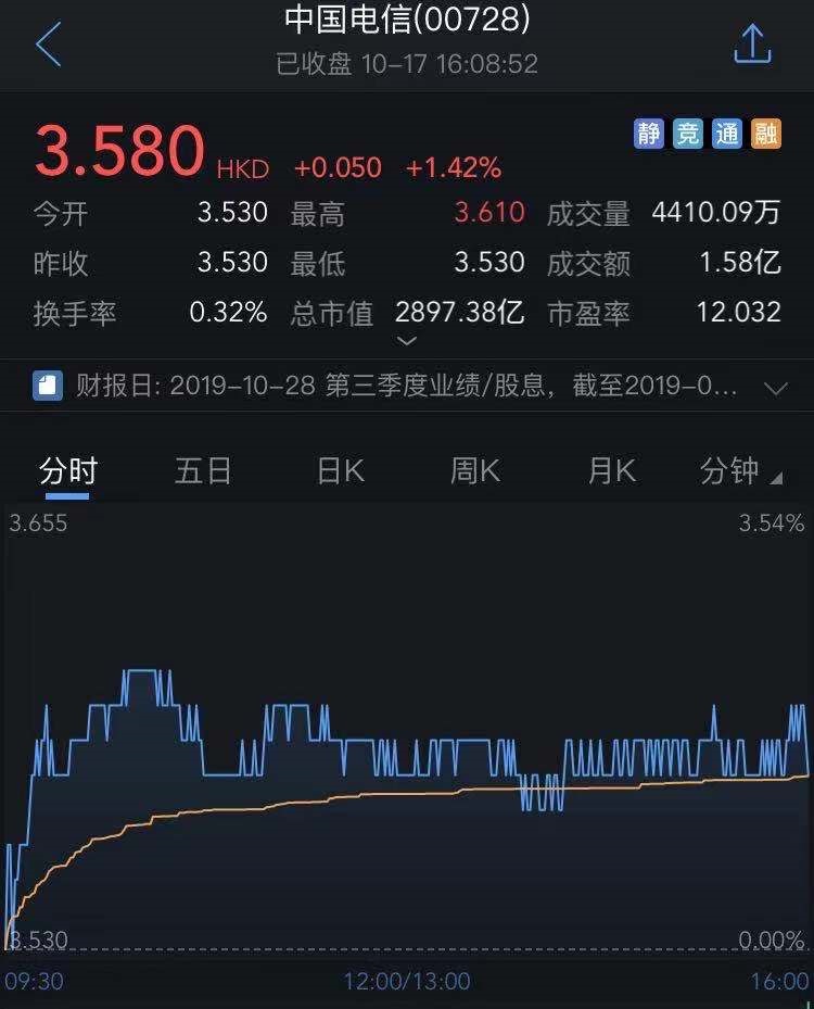 截至今日收盘,中国电信涨1.42%,报3.58港元。