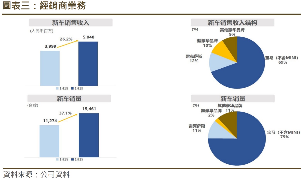 上半年,该公司收入50.48亿元,同比增长26.2%,其中宝马(不含MINI)收入占比69%,雷克萨斯收入占比12%,上半年销量15461辆,同比增长37.1%,其中宝马(不含MINI)销量占比75%,雷克萨斯销量占比11%。