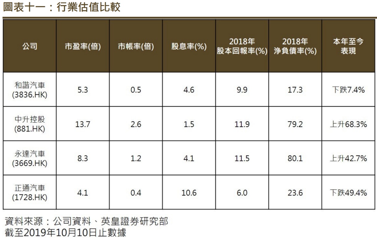 在估值上,根据英皇证券在专访研报,和谐汽车股本回报率与市场龙头接近,凈负债率方面亦具备优势,但市帐率为0.5倍,市盈率为5.3倍,均远低于主流的豪华车经销商,且较同业有较大折让。