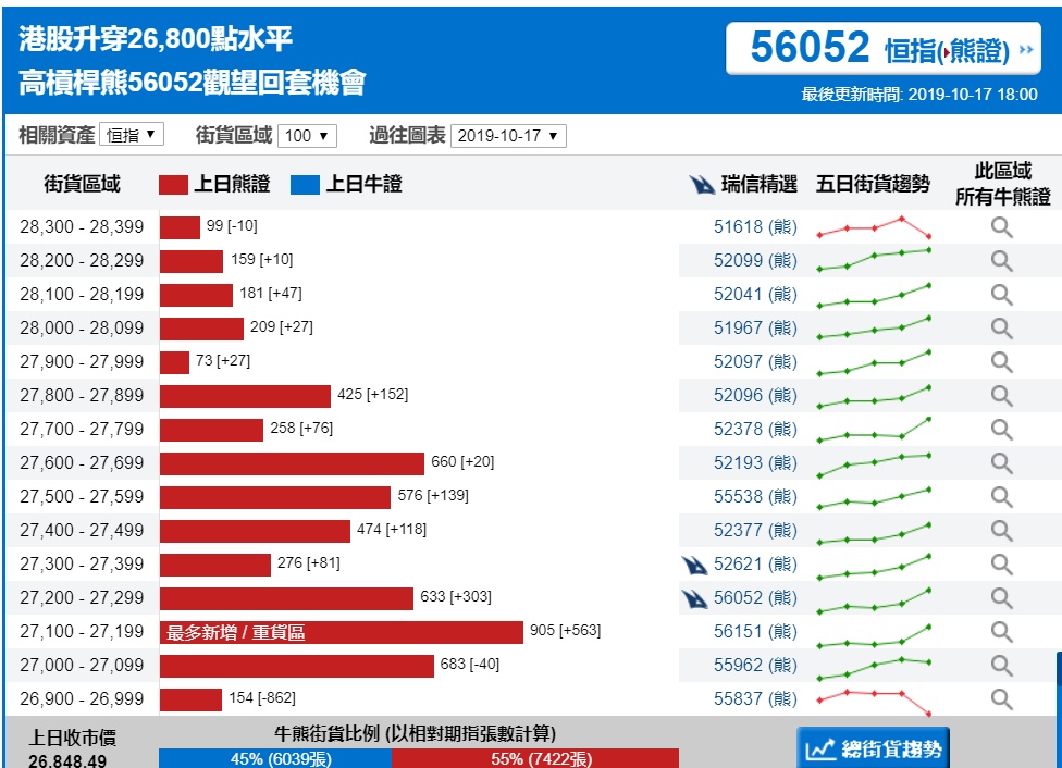 智通财经APP获悉,截至10月17日,恒指最新的牛熊街货比例45:55。瑞信恒指牛熊证街货分布图中的数据显示,熊证街货重货区在27100-27199区间,该区间最新熊证数量为905张,较上一交易日增加563张,最多新增也在该区间。牛证街货重货区在25200-25299区间,该区间最新牛证数量为660张,比上一交易日减少36张;最多新增在26000-26099区间,较上一交易日增加190张。