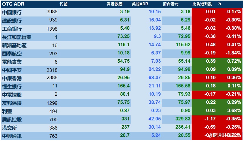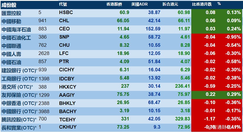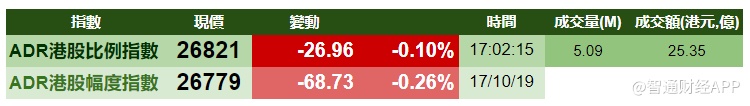 智通财经APP获悉,周四(10月17日)美股低开高走,三大股指小幅收涨。港股ADR指数小幅下挫,按比例计算,收报26821点,跌26.96点或0.10%。汇丰控股收报60.98元,较港收市涨0.08元;腾讯控股收报329.83元,较港收市跌1.17元。