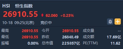 智通财经APP获悉,恒生指数开盘涨62.06点或0.23%,报26910.55点。国企指数涨0.16%,报10604.77点。红筹指数涨0.22%,报4343.96点。大市盘前成交17.7亿港元。
