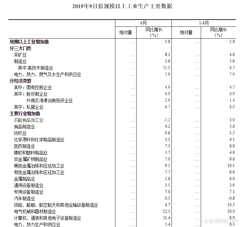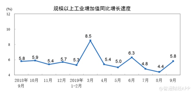 智通财经APP获悉,国家统计局今日(10月18日)公布,2019年9月份,规模以上工业增加值同比实际增长5.8%(以下增加值增速均为扣除价格因素的实际增长率),比8月份加快1.4个百分点。从环比看,9月份,规模以上工业增加值比上月增长0.72%。1—9月份,规模以上工业增加值同比增长5.6%。