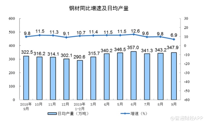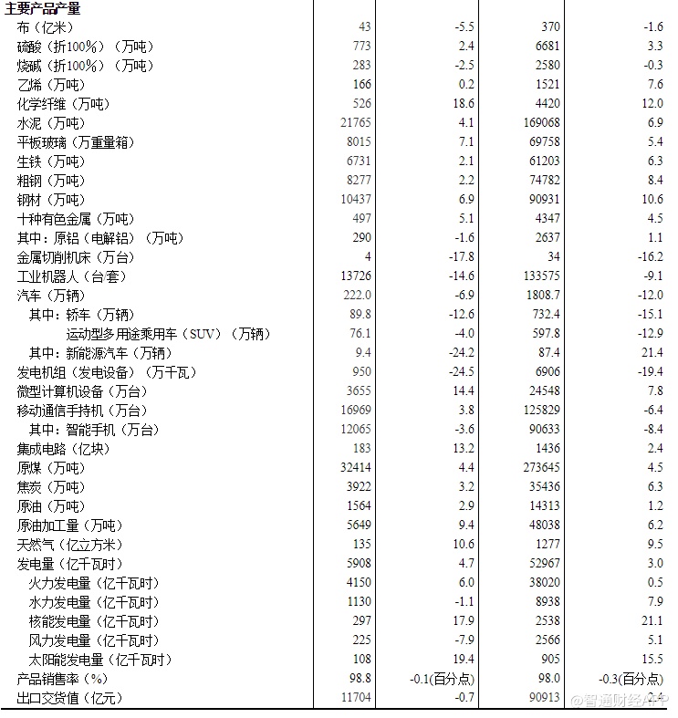 分产品看,9月份,605种产品中有321种产品产量同比增长。钢材产量10437万吨,同比增长6.9%;水泥21765万吨,增长4.1%;十种有色金属497万吨,增长5.1%;乙烯166万吨,增长0.2%;汽车222.0万辆,下降6.9%,其中,轿车89.8万辆,下降12.6%;新能源汽车9.4万辆,下降24.2%;发电量5908亿千瓦时,增长4.7%;原油加工量5649万吨,增长9.4%。