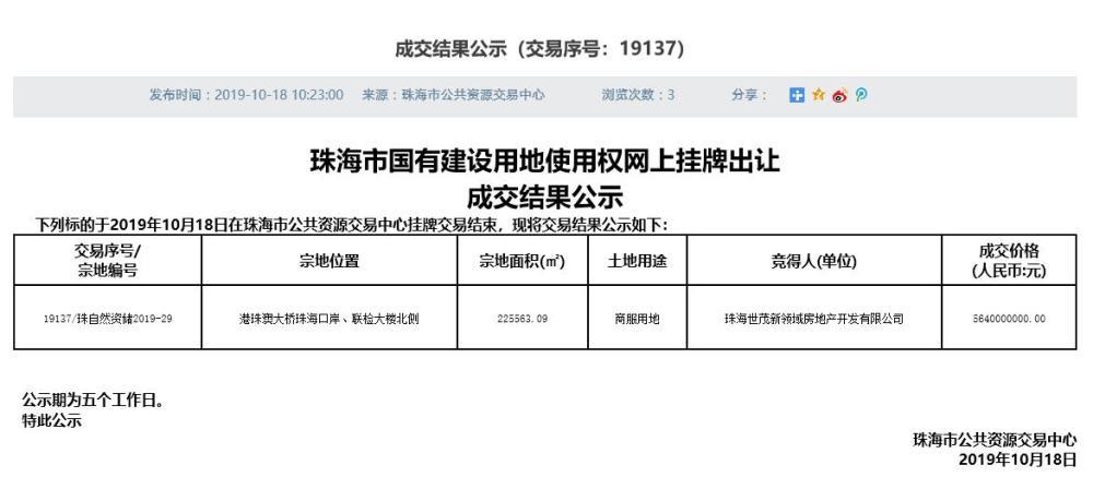 智通财经APP获悉,10月18日,世茂集团旗下珠海世茂新领域房地产开发有限公司以底价56.4亿元投得港珠澳大桥珠海口岸地块,楼面价每平方米5828元。这是世茂集团首次进入广东珠海。